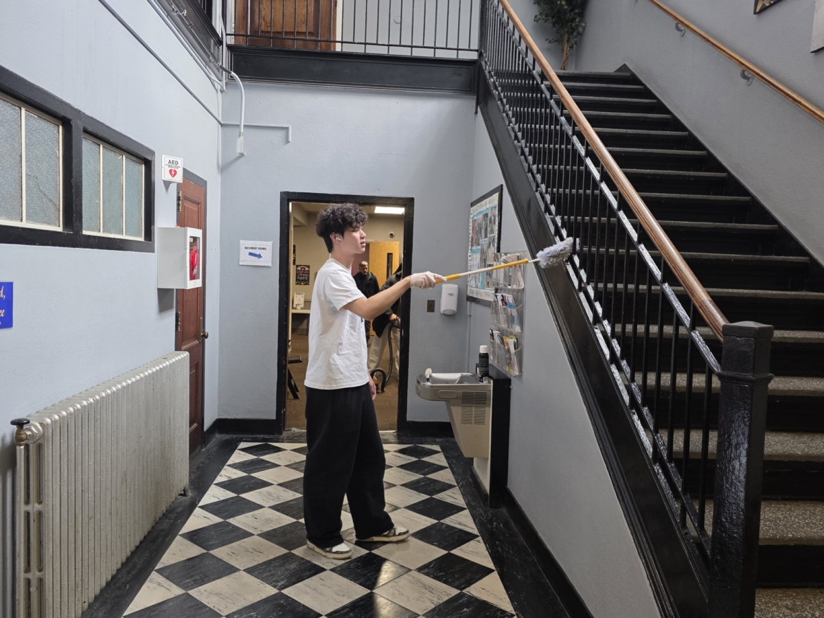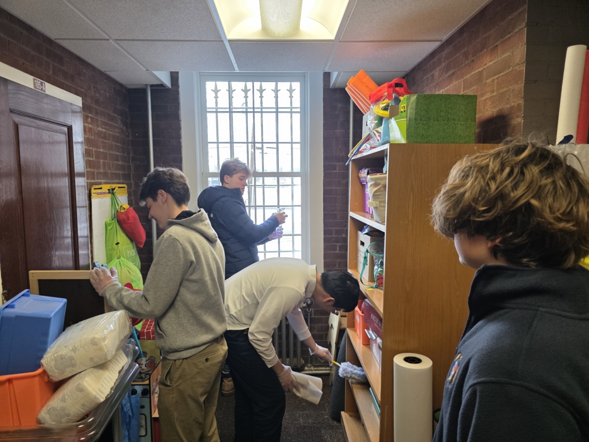 Following the meeting, students enjoyed donuts and sweet treats provided by the SKS Parents Association. For the remainder of the day, students and faculty participated in learning sessions and volunteered for service activities both on and off campus. On campus, groups cleaned and organized shared spaces, including the Art Center and Theatre. Off campus, students assisted with organizing supplies at the Newburgh Armory Unity Center, sorted food at the Hudson Valley Regional Food Bank, and lent helping hands at La Iglesia El Buen Pastor soup kitchen. Others removed invasive species at the Hudson Highlands Nature Museum, helped clean up Donahue Park in Cornwall, refreshed painted walls at the Habitat for Humanity ReStore in Newburgh, and spent time visiting residents at the Sapphire Nursing Home.