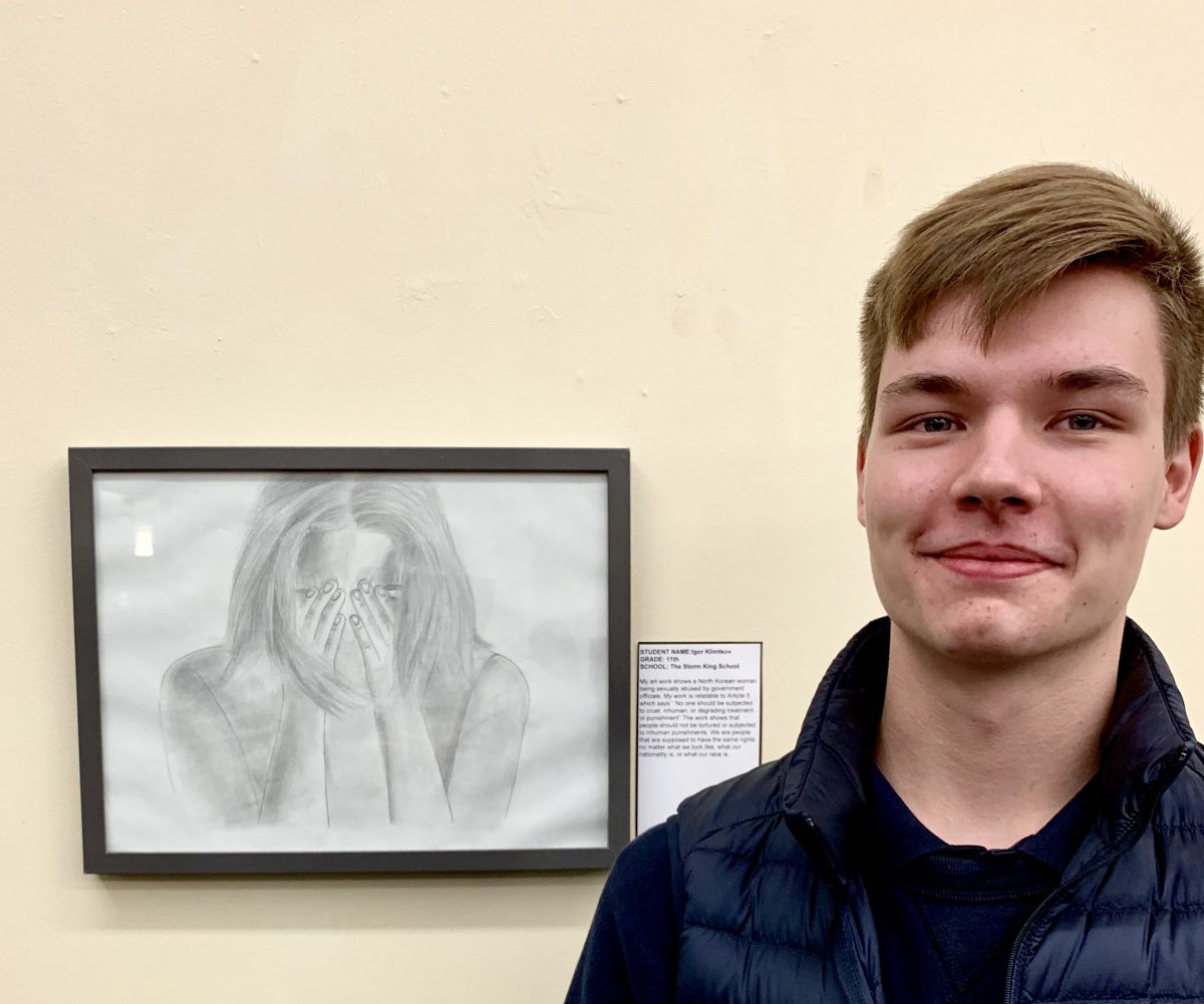 The exhibition, organized since 2012 by the Orange County Arts Council, Cultural Affairs at SUNY Orange, and the Orange County Human Rights Commission, offers young artists a venue to express their feelings about the importance of human rights in today’s world through their artwork, essays and poems. The Storm King School, which has participated in the exhibition every year since its inception, was among nine area high schools that had works on display this winter at the SUNY Orange Newburgh and Middletown, NY campuses.