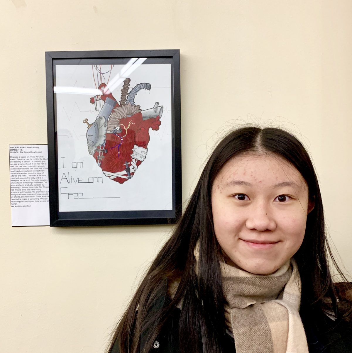 Storm King junior Jessica Ding was among the nine students who submitted artwork from The Storm King School. Her pen and ink work titled “I am Alive and Free,” depicts a heart which is damaged and supported by machinery. “Human emotions come from the heart, which is easily broken or can be taken over by technology. Although we rely on computers and phones, we aren’t machines. Only through our hearts are we capable of having real relationships with others; this makes us free,” Jessica explained as she described the idea behind her work.