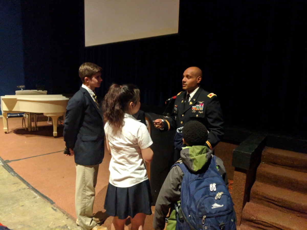 The Storm King School hosted a special visitor from USMA at West Point last week. On Thursday, January 18, Foreign Language Department Deputy Head and Professor of Arabic Colonel John Baskerville spoke to our students about the importance of learning foreign languages. Col. Baskerville was joined by his colleague Captain Serge Ngwanza who is an Instructor of French and the father of 8th-grader Cody Ngwanza. Together, the officers shared many valuable insights from both a cultural and a career perspective.