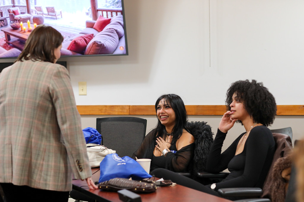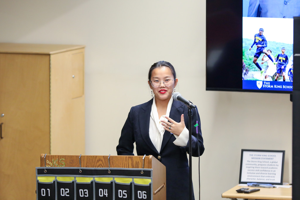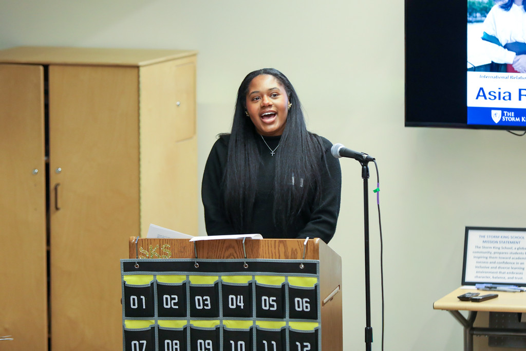 Alumni speakers shared personal stories of challenge and growth, highlighting how Storm King continued to shape their paths long after graduation. Asia Raacke ’19 spoke about finding clarity and confidence through her connection to Storm King, recalling how returning for a hike on Honey Hill inspired her law school personal statement. Seth Vieira ’22 shared how the community supported him through personal loss, affirming his faith and guiding his vocational calling, while Shayla Lawrence ’21 reflected on learning to trust uncertainty and see rejection as redirection. The evening concluded with small-group conversations where students and alumni engage in deeper conversation and exchange information for further connection. Juliana D. ’27 spoke excitedly with Sagan Novesky about Vassar’s campus and course catalog, while Milan R. ’27 sought out alums Sofia Bové and Asia Raacke to discuss their experiences working internationally in law and politics.